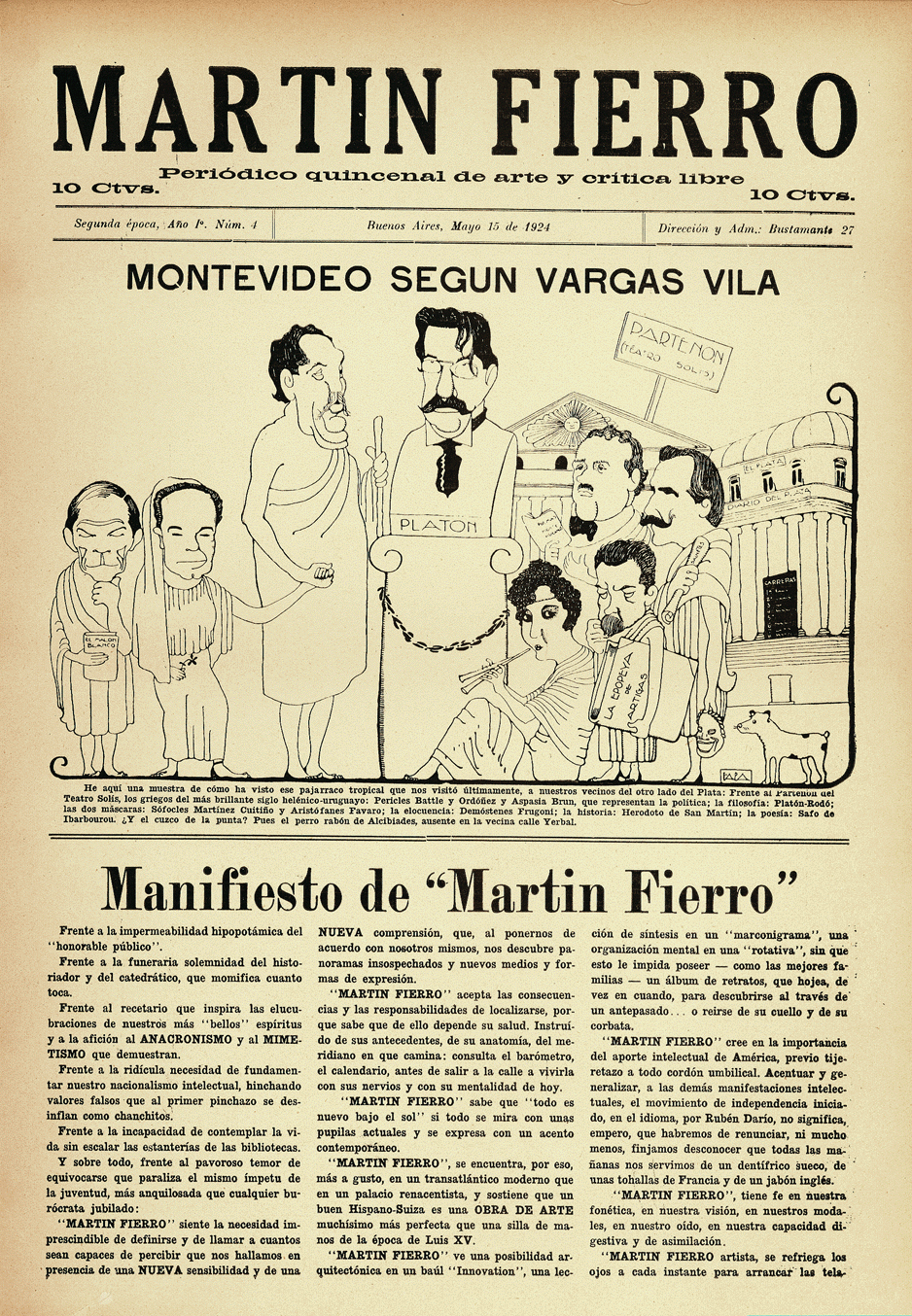 The manifesto credited above with snapping Argentine letters out of an aesthetic stupor was published in 1924 in the journal Martín Fierro, of which Girondo was a founding contributor. Taking its name from José Hernández’s epic poem published in two parts in 1872 and 1879, which presents the rustic gaucho as the emblematic figure of Argentinean-ness over and above the European models of progress adopted by the politicians of the day, the journal stresses the importance of creating a fresh, local style of poetry. It insists that the poet abandon the library.